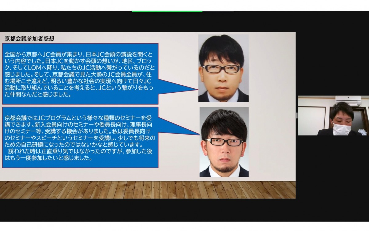 森田委員長を始めとされる結束力向上委員会によりJCでの事業を説明、事業経験者から感想や為になったことをお話しいていただくことで会員の事業に対する意識、それに伴う出席率の向上を呼び掛ける例会行事となりました。
