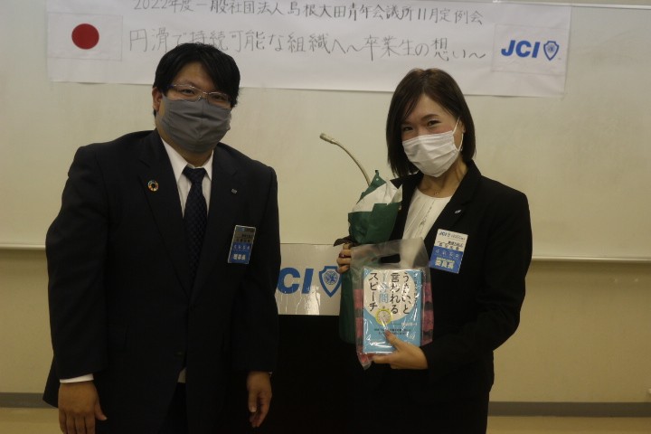 そして例会行事後はLDタイム3分間スピーチの授賞式を行いました。見事に2年連続のベストスピーカーに輝かれた森田君おめでとうございます。