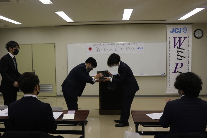 2022年度理事長から、昨年度出向していただいた方々に、1年間のご苦労をねぎらい記念品をお渡し致しました。